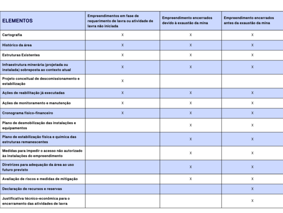 A Resolução ANM nº 68/2021 dispôs regras referentes ao PFM, incluindo os elementos que devem ser abordados pelo Plano e a periodicidade de revisões e/ou atualizações com base na fase do processo minerário. Na tabela abaixo estão listados os assuntos que devem ser abordados pelo Plano de acordo com a fase do processo minerário.
